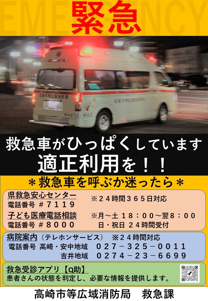 年末年始は多くの医療機関が休診になり、救急要請がひっ迫する恐れ があります。 緊急性の高い症状の方が救急車を利用できるよう、救急車の適正利用