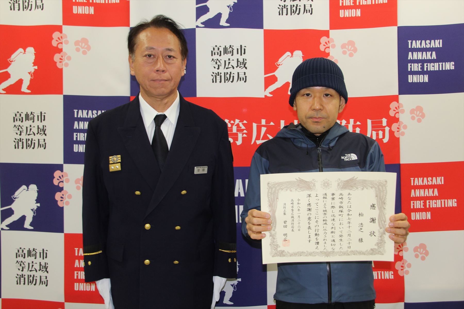 令和7年12月20日(土)に高崎市飯塚町で発生しました事案で119番通報をしていただいた、柏 浩之様に対し、令和8年1月26日(月)に消防局長から感謝状を贈呈しました。