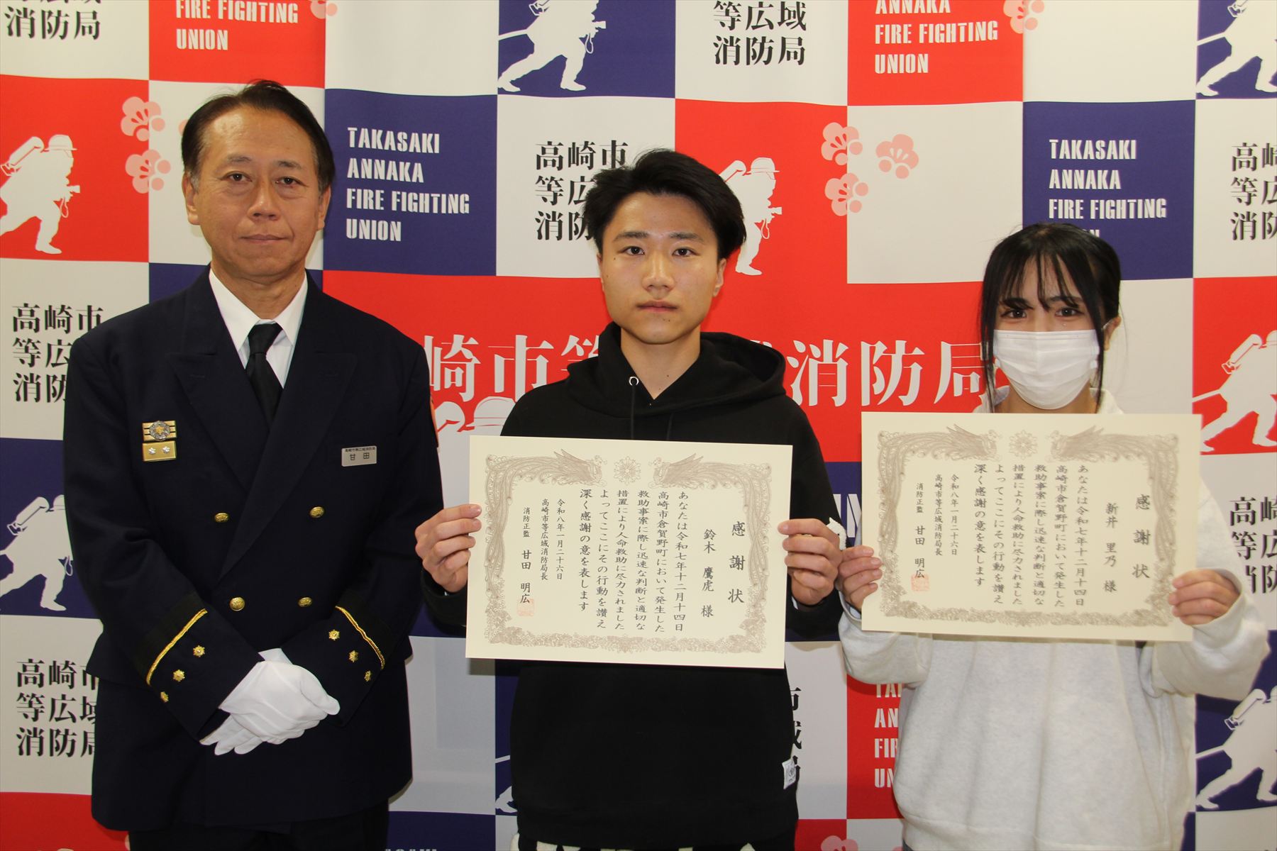 令和7年12月14日(日)高崎市倉賀野町で発生しました救助事案で、人命救助にご協力いただきました鈴木鷹虎様、新井里乃様に対し令和8年1月26日(月)に消防局長から感謝状を贈呈しました。